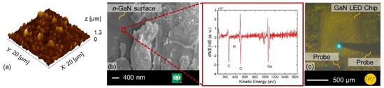 Figure 3a shows an SEM image of a GaN LED wafer after selective outer frame removal by high laser fluence irradiation and remaining intact GaN LED in the middle of the area. After irradiating the intact GaN LED area with lower laser fluence, the GaN LED chip has been lifted and exhibited a crack-free p-GaN surface of the LED chip as seen in Figure 3b. On the other side, the n-GaN surface was affected by laser ablation resulting in marks on the surface (Figure 3c). To investigate the condition of the epilayer quality after LLO, we cut through the GaN LED chips and measured the thickness. From the cross-sectional view, a thickness of ~4.6 μm is observed, showing that the GaN LED epilayer is still complete and less damaged (Figure 3d). However, the n-GaN surface after LLO is relatively rough. Therefore, it has been investigated by AFM and AES (Figure 4a–c).
