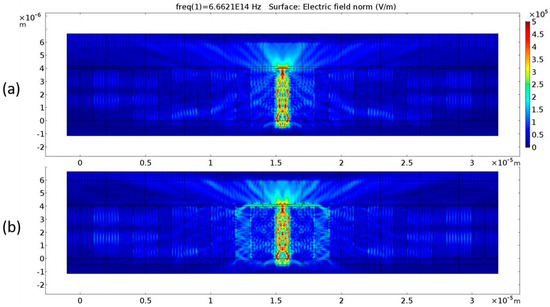The feasibility of a matrix-addressed approach based on fin structures is evaluated with simulations. In this case, several concerns have been raised as the devices were scaled down to submicron sizes (e.g., light emission pattern, crosstalk between the LED pixels, and different conditions of top p-GaN contact). Therefore, the simulations have been used to define general guidelines for the fabrication of the nanoLED array. The simulations were conducted with COMSOL Multiphysics 5.3. To start the investigation, an array of 11 fins with a width of 1 µm and a pitch of 3 µm was created as a basis model for the simulation. A point dipole located at the center of the middle fin and in the height of the multi quantum well (MQW) was chosen and set to simulate the initial point of emission. From the simulations results, it was found that various geometries, wavelengths, and material arrangements will result in different light emission patterns (c.f. Figure 2).