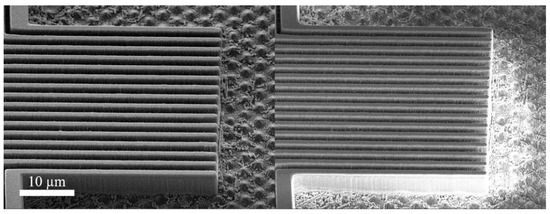 The fabrication of nanoLED array can be divided into four main processing steps (i.e., n-contact opening and definition, fin formation, filling for planarization, and creation of p-contact lines and bond wire pads). First, the device manufacturing starts with the photolithography to create the area for the etching process down to n-GaN, which is around 1.2 µm deep from the initial top p-GaN surface. In this case, rectangular patterned chromium with a thickness of 300 nm was used as a mask followed by inductively coupled plasma dry reactive ion etching (ICP-DRIE) to reach the highly n-doped regime of the LED wafer. Afterwards, the 3D GaN fin LED arrays were created by means of hybrid etching combining both SF6/H2-based ICP-DRIE and KOH-based post-wet chemical etching. It should be noted that the 500 nm thick chromium deposited via electron beam evaporation and partially removed by lift-off was necessary to be used as hard etching mask instead of only photoresist like in Si-based etching [3] due to GaN hardness. To obtain high-aspect-ratio GaN structures with smooth sidewalls and to guarantee insulation among the fins, two-step hybrid etching was employed, which is an enhancement from our previous GaN nanowire etching technique [4,5]. In this case, the first and the second ICP-DRIE steps have etch durations of 45 min and 30 min, respectively. Meanwhile, the wet etching using AZ 400 K developer was kept at the same etch time of 1 h for both steps. The fabricated fin arrays with a width of 1 µm, a pitch of 2 µm and a height of 5 µm are depicted in Figure 3. The quality of the MQW was thereafter determined with cathodoluminescence measurements and showed no deterioration due to the etching procedure.