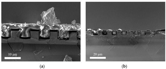 The third step comprises the filling and planarization of the fin structures. The aim is to introduce a flat surface again, so that the next lithography step is possible and to reveal the top facets of the fin structures enabling the p-contact. The polymer benzocyclobutene (BCB) from The Dow Chemical Company (i.e., CYCLOTENE 3022-57) was employed as filling material. In terms of its dielectric characteristic, this material is considered as an isolating low-k material (εr = 2.65), which can be spun on the wafers and subsequently etched with inductively coupled plasma (ICP) dry etching method [6]. The conditions of the samples after BCB filling and its subsequent ICP etching are depicted in Figure 4a,b, respectively. This planarized wafer is the basis for the p-contact deposition to complete the fabrication of the device.