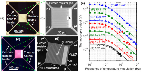(a–d) Optical (a,c) and scanning-electron (b,d) micrographs of device S (a,b) [1] and device P (c,d). The devices have a built-in electric heater for characterization and experimentation, and a thermocouple for temperature readout. The pair of the silicon beams on the left side of the devices provides the electrical connection for the meandered doped silicon heater resistor patterned in the silicon membrane. The 30 nm Al film forms an electrical contact between ends of the n+ and p+ silicon beams acting as thermocouple. Device P has an Al island for scanning probing experiments and additional n and p type doped regions (NIPI) between the heater meanders and the heater and the thermocouple in order ensure good electrical insulation between the doped active regions. However, insulation cannot affect this work because lock-in techniques are used and the excitation and readout is done at different frequencies. (e) Frequency responses of devices S [1] and P measured using lock-in techniques [1]. Symbols are the measured thermocouple output voltage amplitudes as function of the frequency of heater power amplitudes at several power values. The curves show the response [Equation (1)] fitted to the data. The fitting parameters are listed in Table 1.