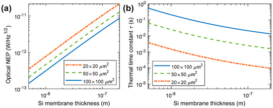 Calculated (a) optical NEP and (b) thermal time constant of the thermoelectric bolometers with various sizes as functions of the silicon nanomembrane thickness [2].