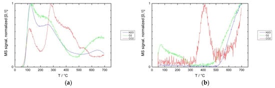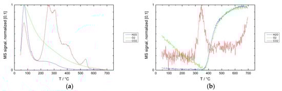 TPD results in He + 12.5 vol% O2 show a similar picture (Figure 2): After exposure to ambient air (a), H2O shows a peak at 75 °C, while CO2 peaks are detected at 70, 260–310 and 540 °C. The O2 signal is only plotted for completeness and shows drift but no desorption. In (b), a CO2 peak is visible at 350 °C, while signals for O2 and H2O increase rapidly at 370 °C, reaching a shallow peak at 660 °C.