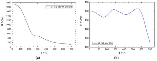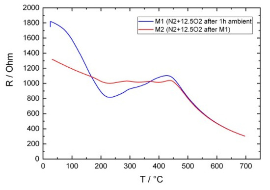 Figure 3 shows R(T) plots recorded for an ITO thick film in N2. Plot M1 was obtained after exposure to ambient air for 1 h, M2 (Figure 3b) was recorded immediately after M1. M1 shows a sharp drop in resistance between RT and 250 °C, followed by a shallow decrease towards higher temperatures. In the subsequent measurement (M2), resistance at RT is only slightly higher than at 700 °C in the previous measurement. When the temperature is ramped up, R exhibits four local extrema, before sharply dropping at 570 °C. In Figure 4, R(T) in N2 + 12.5 vol% O2 is plotted. Measurement M1 was performed after exposure to ambient air (1 h), M2 immediately after M1. Although resistance in M1 again shows a steep drop between RT and 220 °C, the relative change is considerably lower than in N2. Furthermore, after reaching a local minimum at 220 °C, R increases again until it reaches a local maximum at 420 °C, before dropping off a higher temperatures. In the second measurement, R again decreases to a local minimum at 220 °C but remains almost constant until decreasing beyond 450 °C.