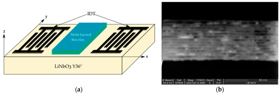 Figure 1. (a) Scheme of a SAW delay line with a magnetoelastic thin film on the travel of the surface acoustic wave; (b) TEM picture of the multi-layered nanostructured thin film.