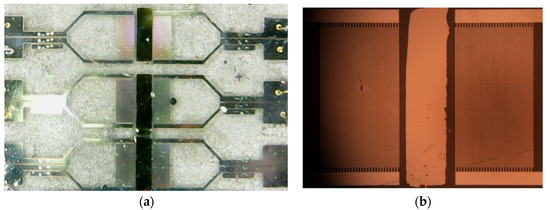 The SAW delay line is manufactured according to a well-known process used in microelectronic technologies, photolithography. An optical mask is first designed to transfer the patterns on a resist layer deposited on the piezoelectric substrate. After exposure and development, the patterns are opened and aluminum used for IDTs is deposited by RF sputtering. A last step called lift-off is required to remove the excess resist and reveal the device as shown Figure 2b.