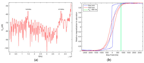 Figure 3. (a) Insertion Loss (S21) measured after time gating; (b) TbCo2/FeCo thin film magnetization characteristics measured using a VSM along the hard axis (red) and easy axis (blue). The anisotropy field is around 800 Oe (green).