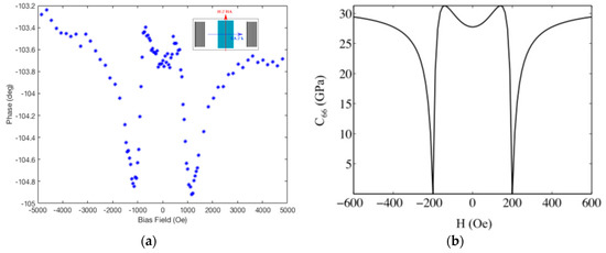Figure 4. (a) S21 phase shift as a function of the bias magnetic field at 146 MHz; (b) c66 elastic constant as calculated with the piezomagnetic equivalent model described in [5].