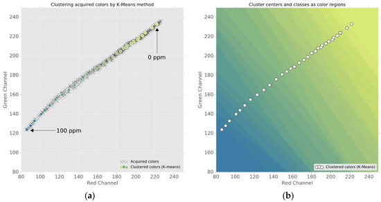 (a) RGB 8-bit color data acquired from a colorimetric sensor captured with a digital camera at 5500 K color temperature exposition (2D color plane with Red and Green channels), with the centers of 32 clusters generated by K-means clustering; (b) 32 clusters centers from (a), and color clustering regions.