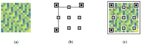 (a) Colors from K-Means clustering (Figure 1b) spread over a square distribution with certain pattern (block size of 3 × 3 pixels, 32 different colors, 7 times redundancy), (b) computing vision patterns of a QR Code version 7 (position, alignment and timing patterns) and (c) a machine-readable pattern for colorimetric sensor interrogation.