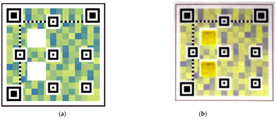 In the design, some regions in the QR Code were reserved (i.e., kept white) to allocate the colorimetric indicator (Figure 3a). The size of the regions reserved to the colorimetric indicator depends on the resolution and alignment capabilities of the printing technique used. In our case, manual screen printing required reserving a region of at least 6 × 6 pixels (Figure 3b).