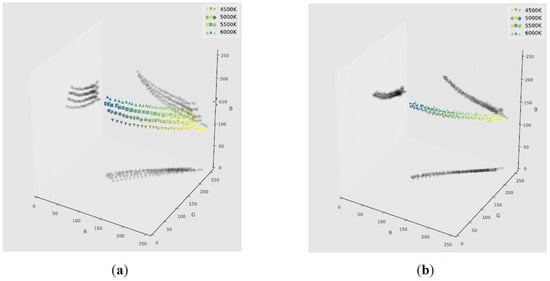 Color data (3D RGB 8-bit cube and corresponding 2D projections) of the NH3 indicators exposed to gas concentrations from 0 to 100 ppm in humid air (50% RH) acquired under different illumination conditions (4500 K, 5000 K, 5500 K and 6000 K color temperature); (a) before and (b) after color calibration.