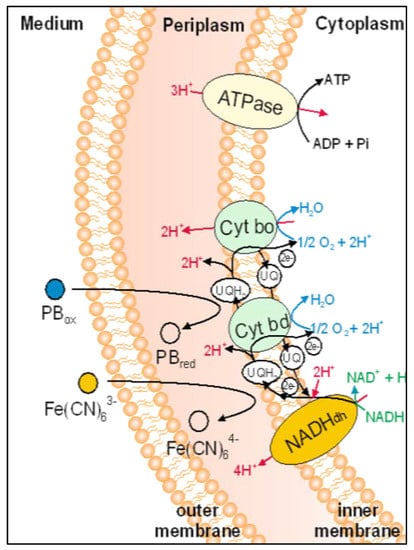 PB molecules were susceptible to microbial reduction by bacterial metabolism electron transfer processes. According to the scheme presented in Figure 1 in the electron transport chain of E. coli, the redox potential of PB was small enough to interact with many of the proteins and mediators present there being reduced.