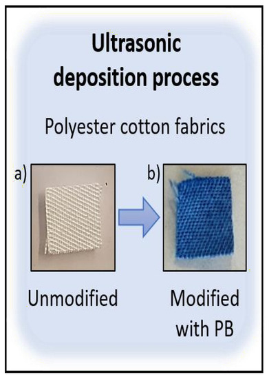 Prussian Blue nanoparticles were deposited into polyester cotton textiles by a ultrasound coating process. Textile samples (3 × 3 cm) were immersed in a solution of Prussian Blue 0.25 mM and were sonicated with a frequency of 37% at 20 °C during three different period of times (5, 15 and 30 min).