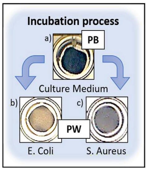 Polyester cotton fabrics modified with Prussian Blue 0.25 mM, were incubated with bacterial samples of Escherichia Coli (E. coli) and Staphylococcus Aureus (S. aureus), with 5.7 × 1010 and 5.9 × 1010 CFU/mL, respectively, during 24 h, in a phosphate buffer solution with 0.1% of glucose. For the textiles with deposited antimicrobial nanoparticles, the same procedure was used.