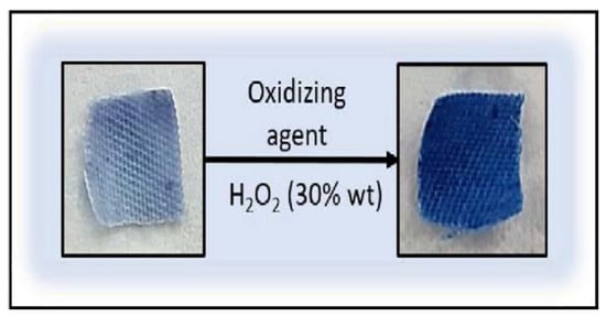 After bacterial assays, reversibility tests were carried out on the textiles with the Prussian White form on them (Figure 5), showing the completely reversion to Prussian Blue after addition of hydrogen peroxide (oxidizing agent).