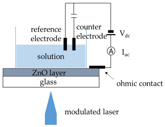 All the chemicals were used without further purification. ZnO was synthesized on FTO-coated glass (1 cm × 1 cm, 15 Ω/sq, Solaronix SA, Aubonne, Switzerland). The substrates were cleaned using acetone (VWR Chemicals, 100%, Lutterworth, UK) and 2-propanol (VWR Chemicals, 100%, Lutterworth, UK) in an ultrasonic bath for 15 min each. ZnO nanorods were synthesized using an aqueous solution method reported previously [15]. ZnO films were produced by increasing the precursor concentration to 100 mM using the same recipe as for the nanorods. For AACVD ZnO, the laboratory aerosol assisted chemical vapour deposition (AACVD) set-up is illustrated in [16]. The AACVD precursor was prepared by dissolving 0.4 g zinc acetate dihydrate in 25 mL methanol. The substrates were placed on a graphite block in the reactor and preheated to 450 °C. The as-prepared precursor solutions were transferred to a Drechsel bottle, and then an ultrasonic humidifier with operating frequency of 1.6 MHz generated an aerosol mist. The mist was continuously passed through the reaction chamber with nitrogen carrier gas at 1.5 L/min until exhausted. The carrier gas was kept flowing until the temperature of the reactor chamber dropped below 80 °C. The total deposition time was 45 ± 5 min. A drop of a 11 wt % PMMA solution in methoxybenzene was deposited on ZnO and dried without assistance at room temperature. The LAPS measurement setup was described in [2] and a schematic is shown in Figure 1.