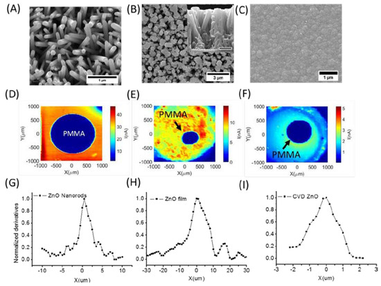Figure 2A–C display the morphology of ZnO made with different methods. The nanorods formed uniformly and were well-oriented with 4.03 ± 0.025 µm in length and 78.4 ± 2.7 nm in diameter. The film in (B) formed columns with much larger diameters in a range of 0.3 to 0.9 µm, which were mostly fused together in a film-like structure (inset Figure 2B) with some gaps still visible in the top view. For comparison, ZnO nanorods and films made with the solution method had the same thickness. ZnO made with AACVD formed a compact film with 1 µm thickness (Figure 2C). Figure 2D–F show photocurrent images with a PMMA dot on the surface of ZnO. Table 1 summarises the maximum photocurrent and spatial resolution in different morphologies. The photocurrent measured on the uncoated areas was much greater on the nanorods than on the film, and the AACVD ZnO film had the lowest photocurrent at a light intensity of 0.05 mW. This is ascribed to the significant larger surface area of the nanorods compared to the film and the CVD ZnO. However, the spatial resolution (FWHM of the first derivative of a photocurrent line scan across the edge of the PMMA dot) in Figure 2G–I did not follow the same trend as the maximum photocurrent, in that the best resolution of 2 µm was obtained for the CVD ZnO followed by the ZnO nanorods with 3 µm resolution and the solution grown film with the poorest resolution of 12 µm. The minority diffusion length in ZnO is shorter than 1 µm, i.e., lateral diffusion of minority carriers cannot explain any differences in resolution between the different morphologies. As the wavelength of the light used in all the LAPS measurements was 405 nm, it is likely that light scattering effects played a significant role in the degradation of the resolution in the solution grown ZnO film because the columns in the film are larger than the wavelength of light. Light scattering effects in ZnO nanorods were negligible as their diameter was significantly smaller than 405 nm, thereby resulting in a better resolution. Light scattering effects for CVD films were negligible because of their small crystal size. As the AACVD films were four times thinner than the ZnO nanorods, they showed a somewhat improved resolution. In conclusion, the morphology of nanostructured ZnO has a significant effect on the spatial resolution in LAPS images due to the thickness of the sensing layer and light scattering effects.