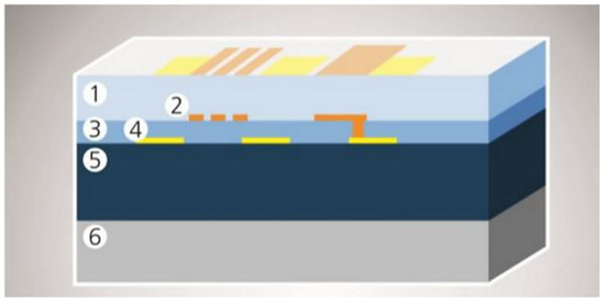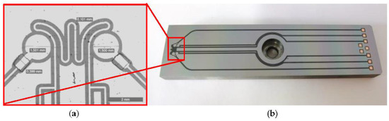 A mold insert with a complete film system, in which alumina is deposited as insulating intermediate and top coating, is presented in Figure 2b. The two circular areas in the photomicrograph are the thermo-resistive sensor areas with negative temperature coefficient (NTC sensor) that are half-enclosed by the meander-shaped structure with positive temperature coefficient (PTC sensor) also used for temperature detection.