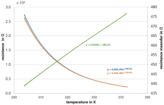 Therefore, the coated mold inserts are integrated with a Pt100 reference resistor in direct touch with the multifunctional layer system. In Figure 3 the characteristic curves from the sensor structures of one sensor insert are shown exemplary. The meander structure out of chromium shows a linear resistance dependency on the temperature and the two circular structures show the exponential resistance dependency on the temperature as it is well known from semiconductors.