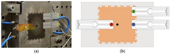 (a) Three integrated sensor modules in the polymer injection mold; (b) Color positioning of the three sensor areas.