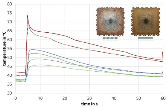 Temperature distribution in dependence on the time for two injection molding processes. Dotted line is the not perfectly fabricated part.