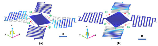 Schematic of the MEMS mirror, blue arrow shows the direction of magnetic field B, red arrows show the directions of current, green circles show the directions of force. (a) The φ tilt mode. (b) The θ tilt mode.