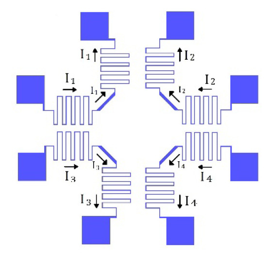 Figure 1 shows the schematic of the micro-mirror device. The square-shaped mirror is connected to a fixed frame using 4 flexures at its corners. An external magnetic field of 0.1 T was supplied by a permanent magnet. The magnetic field is oriented 45° with respect to the mirror sides. Each flexure has two conductors, allowing electrical current (I1, I2, I3, I4) on each side of the mirror to be individually controlled. Figure 2 shows the four coils and the possible current paths. Each flexure has two wires on it, carrying separate currents. For example, wires for I1 and I2 are on the top flexure in Figure 2. Therefore, all the four sides of the mirror can be individually actuated. The Lorentz force exerted on the flexures and mirror sides is governed by Equation (1).
