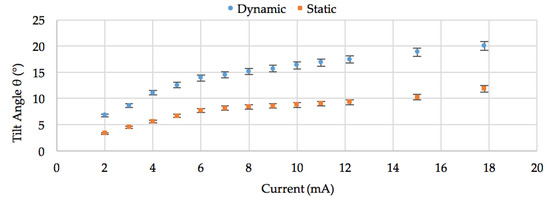 The static and dynamic modes were measured by applying dc and ac current. In the static mode, tilt angles of 5.1° in φ mode and 11.8° in θ mode were measured. In the dynamic mode, tilt angles of 14.5° in φ and 20° in θ were measured at 238 Hz and 244 Hz resonance frequencies respectively. The power consumption with an input current of 18 mA was 2 mW which caused a temperature rise of 15 °C on the flexures. The variation of tilt angles of φ and θ versus applied current are shown in graphs of Figure 4 and Figure 5 for static and dynamic actuations. The third mode of motion was operated by actuating all the 4 sides together. The mirror showed a linear motion of 200 µm with 65 mW of dc power.