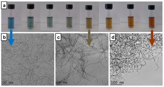 Figure 1. (a) Control of the silver island density from WO3-x NWs (left) to Ag/WO3 NWs (right) as a function of time. TEM images for WO3-x NWs (b), intermediate density of silver islands on NWs (c) and final Ag/WO3 NWs (d). - -