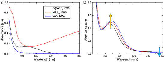 UV-visible absorption spectra for the three forms of tungsten oxide NWs (a) and evolution of the absorption spectra with silver growth for Ag/WO3 NWs (b).