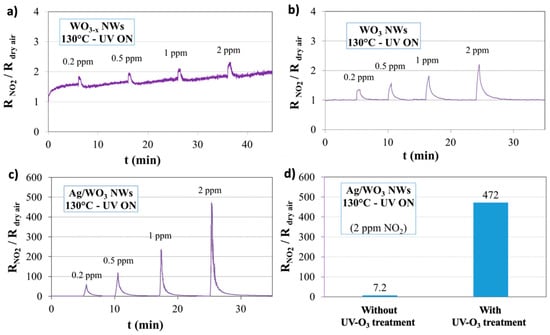 Sensor responses at 130 °C under UV illumination for WO3-x NWs (a), WO3 NWs (b) and Ag/WO3 NWs (c). Comparison of the sensor responses for Ag/WO3 NWs with or without the UV-O3 post-treatment (d).
