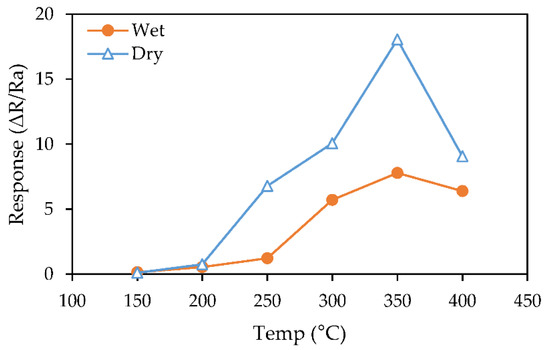 Sensor responses to 20% O2 as a function of the operating temperature in dry vs. wet air (85% RH).
