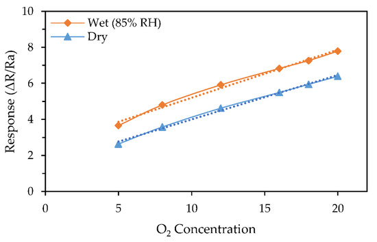 Sensor responses toward various oxygen concentration in dry and wet air (85% RH).