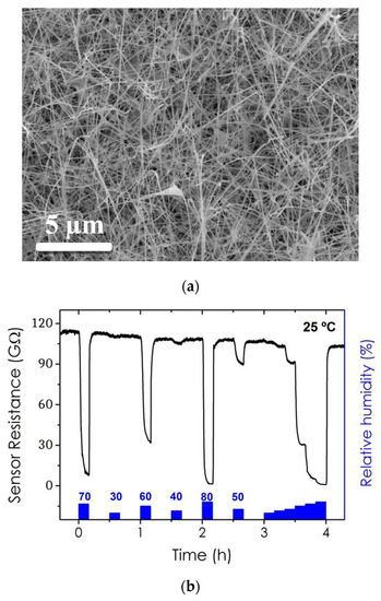 (a) Gallium oxide nanowires grown via gold-assisted vapor-liquid-solid process using chemical vapor deposition techniques and carbothermal reduction at 800 °C; (b) Gallium oxide nanowire-based gas sensor’s resistance evolution towards varying concentrations of relative humidity in synthetic air at room temperature.
