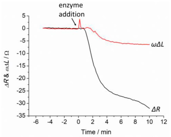 Degradation of the hydrogel by collagenase was monitored using QCM measurement. The QCM data was analysed using the Butterworth Van Dyke (BVD) equivalent circuit with ΔR representing the viscoelasticity and ωΔL representing the mass of the hydrogel on the gold coated QCM crystal [6]. Prior to the degradation experiment, the hydrogel was first equilibrated in PBS buffer pH 7 before exposure to collagenase. Varying concentrations of collagenase (0.2–2000 nM) were used to investigate the effect of enzyme concentration on the degradation of the hydrogel with degradation recorded for 10 min after exposure to collagenase.