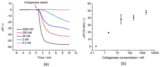 (a) QCM response, ΔR of 100% GCRDVPMS↓MRGGDRCG cross-linked PEG after addition of 0.2 nM, 2 nM, 20 nM, 200 nM and 2000 nM at t = 0. (b) Concentration dependence of the QCM response, average of ΔR, measured for 10 min after the addition of collagenase.