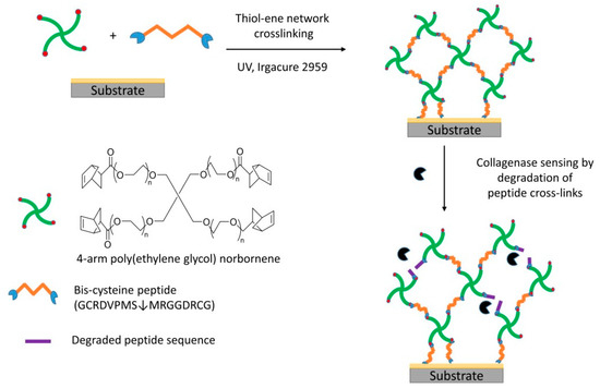 Poly(ethylene glycol) (PEG) is a hydrophilic polymer and has been reported to have anti-fouling properties [4]. The use of dendritic architecture of PEG as biosensor material is promising as it has more active sites for cross-linking and low non-specific binding. The cross-linking of 4-arm PEG norbornene with specific peptide sequences is likely to offer good sensor responses and high specificity based on the peptide cross-linker used. In this study, the peptide cross-linker, GCRDVPMS↓MRGGDRCG was used to cross-link 4-arm PEG norbornene (MW 20,000) to detect collagenase. A solution containing the peptide and polymer in PBS pH 6 was drop coated onto a hydrophobic glass slide. The QCM crystal was placed on top of the solution. The hydrogel formed after UV exposure for 300 s. The degradation of peptide cross-linked PEG was detected in the presence of collagenase using QCM measurements (Scheme 1). The sensor was shown to be sensitive in a concentration range of 2 nM to 2000 nM.