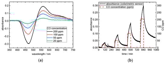 (a) Spectral response of a binuclear rhodium complex to CO concentrations from 20 ppm to 100 ppm in ATR mode; (b) Transient response of a colorimetric sample to CO concentrations in the range from 20 ppm to 200 ppm in ATR mode at 470 nm.