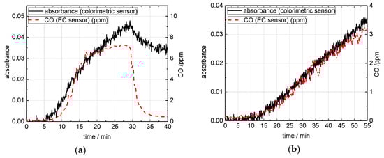 Comparison of the response of a colorimetric sample in ATR mode at a wavelength of 470 nm and the measured CO concentration (a) to gases from a smoldering wood fire type TF2a as described in EN54; (b) to gases from a slowly evolving smoldering wood/plastics fire.