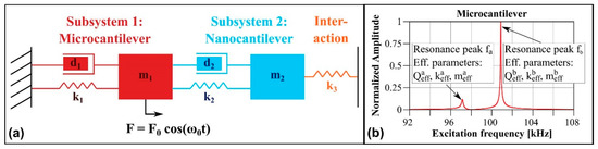 Figure 1b depicts an exemplary amplitude response curve of the coupled system obtained for the microcantilever and based on the parameters from Table 1 and for −2% eigenfrequency deviation, i.e., the nanocantilever’s eigenfrequency is 2% lower than that of the microcantilever. Two resonance peaks are clearly visible and to distinguish between the effective properties of these resonance peaks and the properties of the individual beams, the subscript a, b will be used for the former and 1, 2 for the latter. Thereby, a always denotes the left resonance peak at the lower frequency and b the right one (higher frequency) of the coupled system as indicated in Figure 1b.