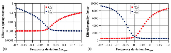 Graphs for the effective spring constant and quality factor are depicted in Figure 2 for the exemplary sensor parameters from Table 1. In that case, the eigenfrequency ω1 was kept constant while the eigenfrequency of the nanocantilever ω2 was varied, hence ∆ωeigen = (ω2 − ω1)/ω1.