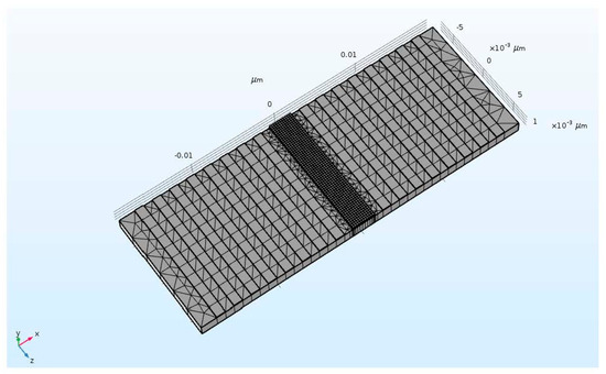 To simulate an IIP-based SAW, the sensing area was subdivided in elementary blocks whose physical properties can be modified separately and whose dimensions are equal to that of a Pb2+ ion. Three configurations have been considered: a non-imprinted polymer (NIP) where all the elementary blocks were filled with a polymeric material, IIP where some of blocks are filled with lead ions (IIP before extraction) or with vacuum (IIP after extraction). Periodic boundary conditions were applied along the z axis in order to simulate the entire device with a reduced geometry. Free tetrahedral mesh was created on the Cr/Au thin layers while, a swept mesh was applied on the sensitive layer (Figure 1).