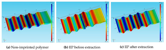 Snapshots of the displacement in z direction at 9.63 ps for: (a) the non-imprinted polymer. (b) the IIP before extraction. (c) the IIP after extraction.