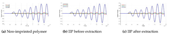 Displacement’s amplitudes in the x, y and z directions with time for: (a) the non imprinted polymer (NIP), (b) the IIP before extraction and (c) the IIP after extraction.
