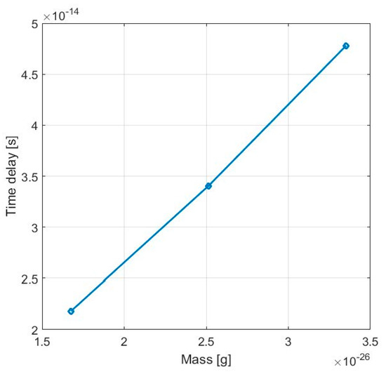 To calculate the mass sensitivity S of the IIP/SAW sensor, the number of the extracted ions was varied. The variation of output voltage compared to IIP after extraction is shown in Figure 4. Sensitivity was computed from the slope of time delay/mass curve and was found of order of 1.5504 s/pg.