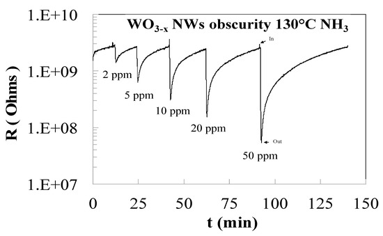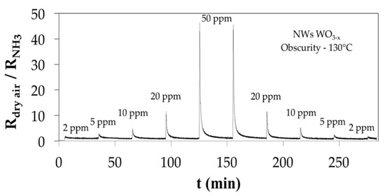 Resistance variation of WO3−x NWs with NH3 exposure with the concentrations of 2, 5, 10, 20 and 50 ppm at a working temperature equals to 130 °C.