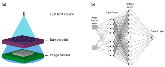 The experimental setup for the cell imaging by digital holography is depicted in Figure 1a showing the DHM as well as position of the cell sample. The DHM was utilized in this work to acquire the cell images that were used as both training data and ANN inputs. It consists mainly of an LED light source and a complementary metal oxide semiconductor (CMOS) image sensor [5]. In the DHM, different cell cultures including immortalized mouse astrocyte cultures were placed closely above the sensor and illuminated by the partially coherent LED light source. The diffraction pattern of the sample was recorded by a CMOS sensor and reconstructed by computation using the angular spectrum approach [6].