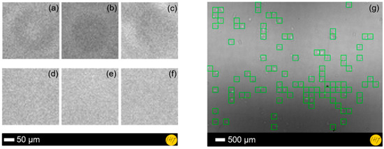 PCA and ANN references for learning process: (a–c) 50 × 50 pixels cell images and (d–f) 50 × 50 pixels background images. (g) Result of the proposed ANN for the microscopic images showing its ability to detect 93 cells from a total number of 115 immortalized mouse astrocytes.