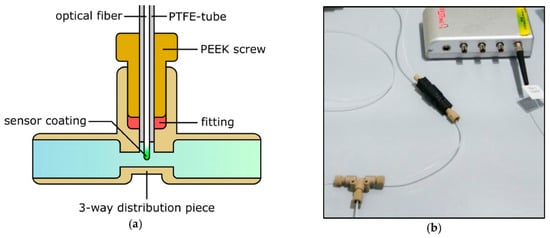 The sensor fiber (WFGe 400/440 T obtained by Ceramoptec) is decladded and the tip is sharpened by flame-cutting and grinding. The sensor coating, containing the NIR emitting phosphorescent sensor dye [] is carefully applied onto the tip. A fitting PTFE-tube is pushed over the fiber by which the sensor can be equipped with a PEEK HPLC screw and fitting. The fiber can be positioned exactly within the flow-through channel by sliding it within the tube before screwing the sensor tight (Figure 1).